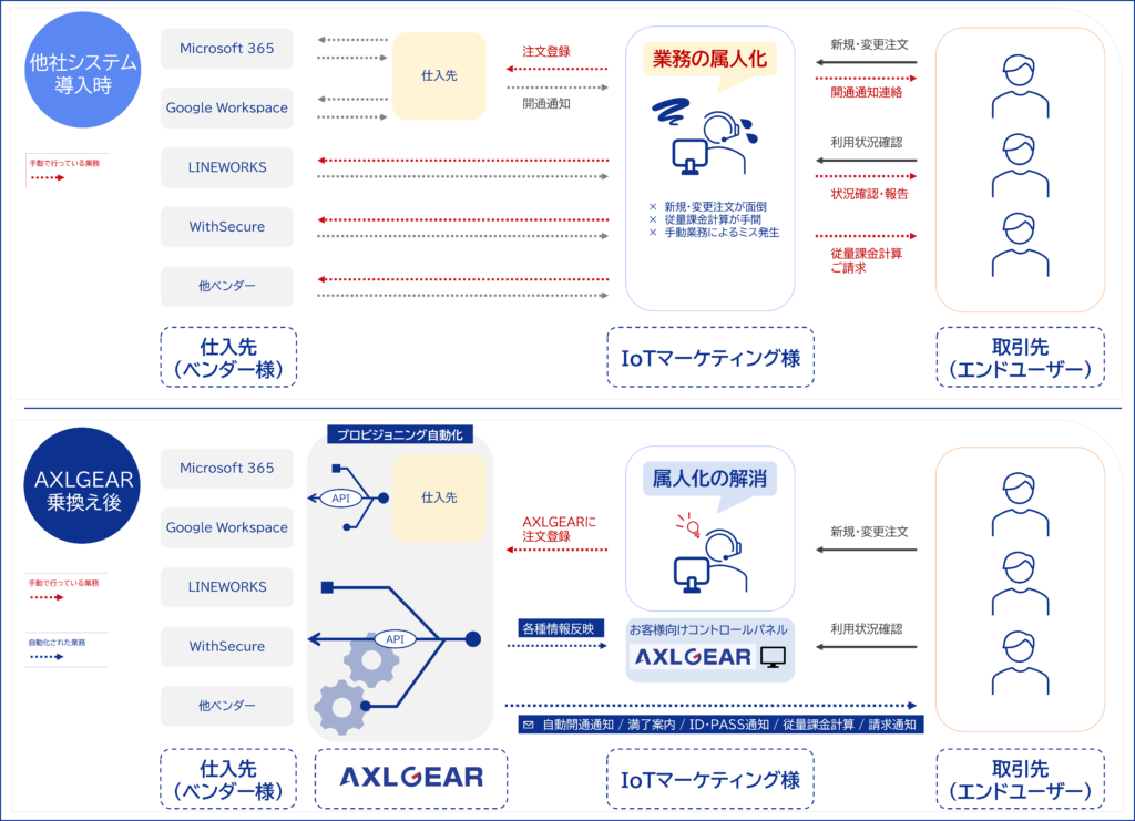 IoTマーケティング株式会社は、Microsoft 365、Google Workspace、LINE WORKS、WithSecure など、多岐にわたるクラウドサービスを提供していた。2020年から本格的にクラウド/SaaS事業を開始したが、当初は他社の管理システムを導入していたものの、登録作業を手作業で行う必要があり、さらに従量課金計算もその都度手動で処理しなければならないという課題を抱えていた。「顧客数の増加に伴い、運用担当者や営業担当者の業務負担が増加し、業務の効率化が急務となっていた。」そう語るのは、西岡基代表取締役。今後もクラウドサービス事業の拡大を目指す同社は、運用面の課題を解決するために管理システムの乗り換えを検討。複数のシステムを比較検討した結果、複雑な商流を一つの画面で一元管理できる点や、仕入れ先ベンダーからのプロビジョニングを自動化できる点が決め手となり、AXLGEARの導入を決定した。